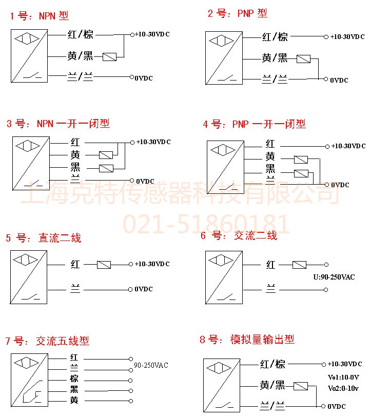 -开关量输出种类丰富,分直流二线、直流三线、直流四线及交流二线,常开常闭,NPN或PNP极性任选。