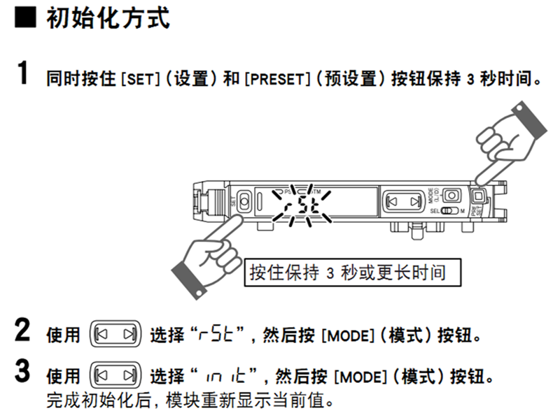 FS-V11传感器调整方法 这个是传感器的型号,FS-V11的是 NPN型,而FS-V11P是PNP型。 FS-V11的棕色线接在正极24V上, 蓝色线接在负极0V上,黑色线是信 号线,接在控制线圈负载的负极性 动作指示灯,当红灯亮时, 黑色信号线有 输出电压。 数值显示, 显示测量的 数值及设定 的数值。 手动键, 用于加减 数值和模 式的选择。 棒状灯,在正常动作 测定时,显示光的强 弱;在模式选择时, 显示光的强弱类型及 延迟类型。 SET键,即 自动设定 键,用于 自动设定 阀值。 MODE键,即 模式选择键, 用于显示数据 和模式之间的 切换。 型号判别 按钮功能 输出选择 开关,有 light 显示数据1234 123P 1234 -HLD -HLD 123P 受光量显示值,显示当前检测到 的光量数值,会随着光纤感受到 的光的强度的变化而变化,最大 值为4095,最小值为0。 每快速按一次模式选择键,就会 在上面的4种状态下切换一次。 额定增益显示,即光量的比例值的显示, 例如:测定值=设定值时,显示100%;测 定值2=设定值时,显示50%;测定值=设 定值2时,显示200%,也就是进行一个 换算,测定值相当于设定值的百分之几, 比例值能够反映出来Light on或Dark 作的信号是否稳定。锁定动作 同时按住手动键的上键和MODE键,或同时按 住手动键的下键和MODE键 3秒以上,当显示 Loc时,即锁定完成。 重复上述步骤,当显示unL时,即解除锁定完成。 光源强度和计时器的模式选择 按住MODE键 3秒以上,即进入到光源强度和延迟时 间的模式选择中,先默认进入到光源强度选择模式, 用上下键选择光源模式,有FINE,TURBO和SUPER 这3种模式,FINE是在短的检测距离中检测微小差异 时使用,TURBO是在FINE模式的检测距离不足时使 用,SUPER是在环境严苛如有灰尘时使用。 再快速按MODE键一次,即进入到延迟时间的模式选 择中,有OFF,10ms和40ms 这3种模式。 再快速按MODE键一次,就回到了受光量的当前显示。 灵敏度设定一、两点自动设定法 光弱的时候,按下SET键,然后光强的时候, 按下SET键,放大器就会自动计算设定值, 设定值=(光弱的值+光强的值)2例如:光弱的时候数值是500,光强的时候 数值是1500,那么在两点自动设定操作后, 放大器自动计算出来的设定值就是1000, 检测到的光小于1000的时候,Dark on就会 有输出信号,检测到的光大于1000的时候, Light on就会有输出信号。 二、手动微调设定值 在显示受光量当前数值时,按上下键,数值闪烁, 马上再按上下键时,就会加减设定值的数值。 在显示增益比例值时,按上下键,比例值闪烁,马 上再按上下键时,就会加减比例值,同时自动换算 设定值,当比例值=100%时,检测的光量值刚好等 于设定值,输出信号就会不稳定,时有时无;当比 例值大于110%时,设定值就会变化并且小于实际 光量值,使得Light on信号稳定;当比例值小于 90%时,设定值也会变化并且大于实际光量值,使 得Dark on信号稳定。 例:当前光量为500,设定值也是500,那么比例值 就会显示100%; 当前光量为500,设定值是1000,那么比例值 就会显示50%; 当前光量为1000,设定值是500,那么比例值 就会显示200% 按SET键 按上下键可 调整设定值 和比例值