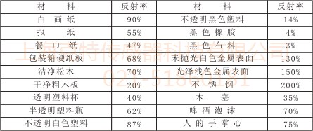 对于漫反射型光电传感器发出的光线需要被检测物表面将足够的光线反射回漫反射传感器的接受器,所在检测距离和被检测物体的表面反射率将是决定接受器接收到光线的强度大小,粗糙的表面反射回的光线必将小于光滑表面反射回的强度,而且,被检测物体的表面必须垂直于光电传感器的发射光线。常用材料的反射率参考图如下所示: